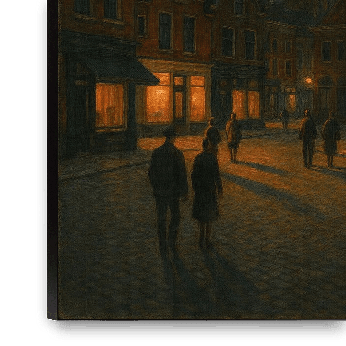 The Grote Kerk of St. Bavo rises over Haarlem’s historic square, bathed in the fading amber light of evening. The windows of nearby houses and shops glow softly, casting long shadows across the cobblestone. Figures stroll through the square — not hurried, but drifting — absorbed in the rhythm of dusk.