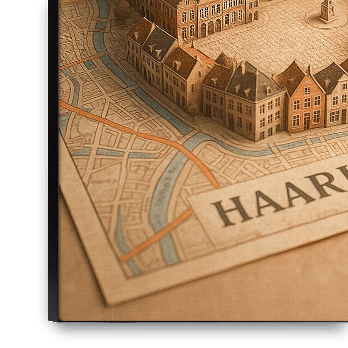 Discover the hidden gem of North Holland with this Haarlem 3D Map Diorama. The artwork is centered around the massive Grote Kerk (St. Bavo), a Gothic masterpiece that towers over the Grote Markt square. The church is surrounded by a ring of historic gabled houses, creating a "fortress of culture" that rises from the vintage map…