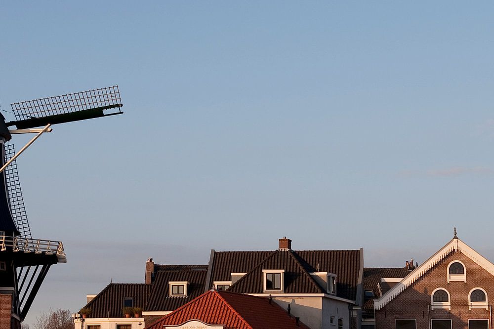 Mill along the Spaarne the old skyline of the capital city Haarlem.
