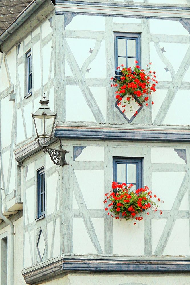 The blue accents in this photo make it fresh and cheerful along with the pretty flower boxes with red geraniums. Walking through old towns and villages, these houses are always beautiful to see. Often well maintained and usually still in their original condition, too. During our motorbike ride through Germany, you come across many beautiful houses and places. I have a weakness for such beautiful houses and love to photograph them. I think this is a cheerful fresh summer photo.