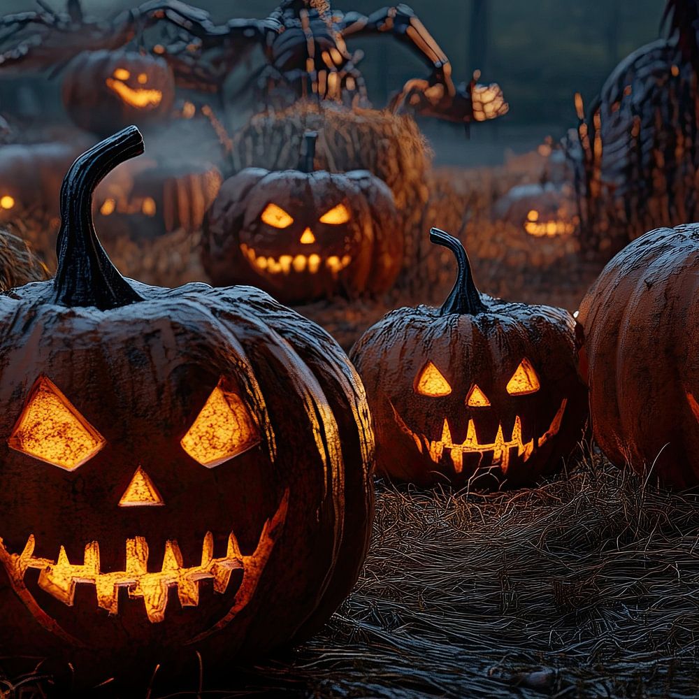 Enter a world where mystery and magic come together with this impressive scene full of Halloween-inspired vibes. At the heart of a misty, mysterious environment stand terrifying pumpkins with grinning faces, their eyes glowing in the dark. This dark scene seems straight out of a horror story. The pumpkins, carefully carved with grotesque facial expressions, cast a ghostly light that pierces the surrounding fog, creating a surreal effect.