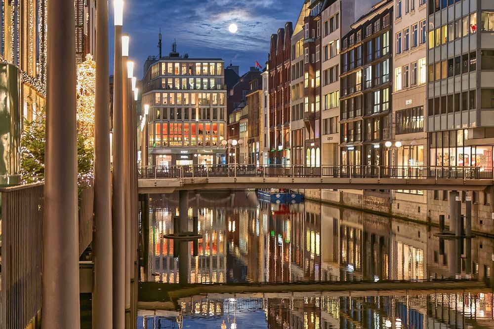 View of the Fleet in Hamburg's city centre at night and fully illuminated