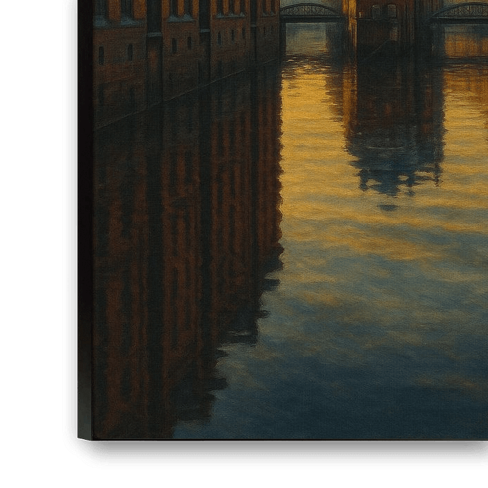 Hamburg’s Golden Reflections captures the soul of the Speicherstadt at dusk — that suspended hour when the city exhales and the waterways glow like mirrors of molten gold. The red-brick warehouses, rich in history and texture, stand solemnly on either side, their reflections trembling softly in the canal. At the center lies the Wasserschloss, illuminated by fading sunlight, holding the viewer in the delicate balance between structure and stillness. Inspired by Edward Hopper, this work transforms industrial geometry into poetry — a dialogue between architecture, silence, and light.