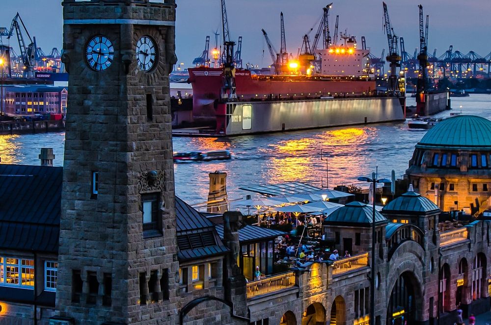 Hamburg St Pauli Landungsbrücken with shipyards docks and Elbe river at dusk Germany