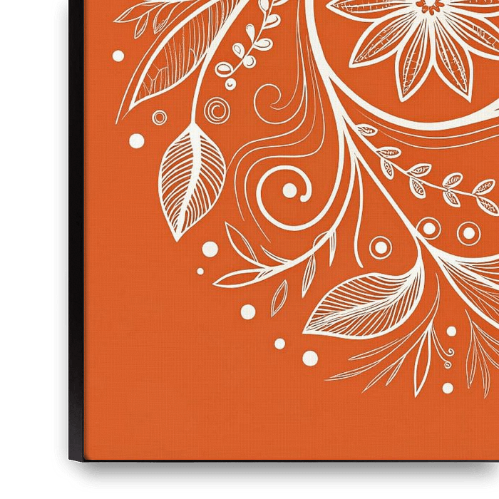 Buy this abstract artwork Hand-Drawn Floral Mandala Art Print: Intricate White Botanical Design on a Bold Orange Background by Artistic on canvas, ArtFrame, poster and wallpaper, printed on demand in high quality.