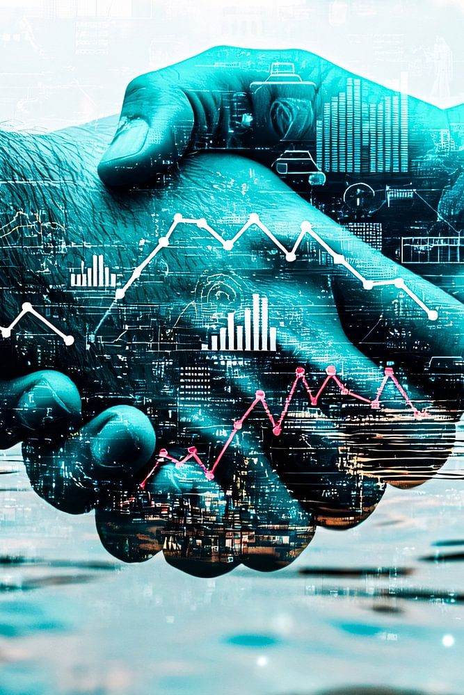 This striking design combines a powerful handshake with graphics such as soaring graphs and futuristic technology. It exudes a sense of collaboration, innovation and business progress. Perfect for a modern office space, it adds dynamism and professionalism to any environment. The cool tones of blue and turquoise create a calming yet energetic effect. This visually captivating piece inspires connection and growth. A must-have for anyone looking to make a statement with modern art.
