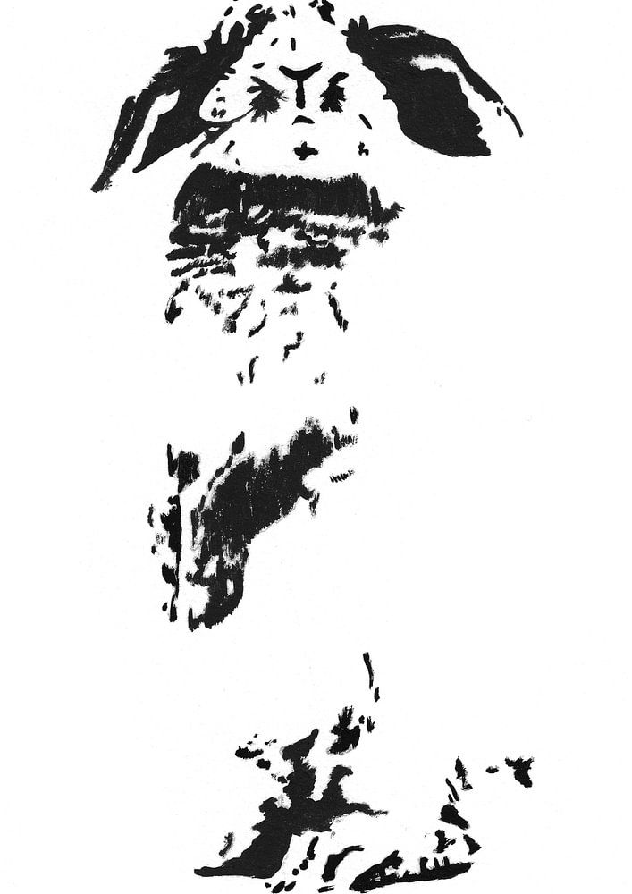 Black-and-white abstract and minimalist painting - digitised - of a hang-eared rabbit standing curiously on her hind legs.