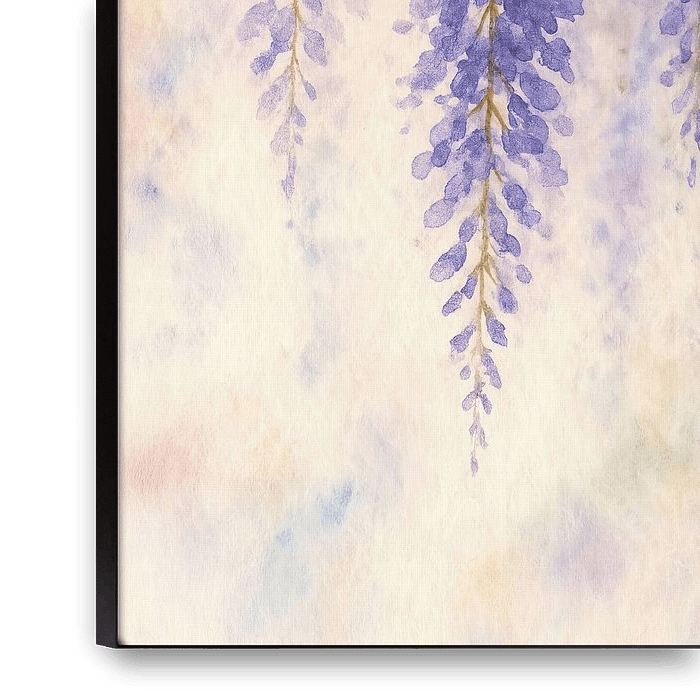 This painting shows hanging clusters of wisteria falling gracefully down from a thin branch. The blossoms are composed of soft layers of purple and blue, with each flower only subtly indicated. The leaves at the top are painted loose and light, almost seeming to dissolve into the background. Small colour gradients and transparent washes…