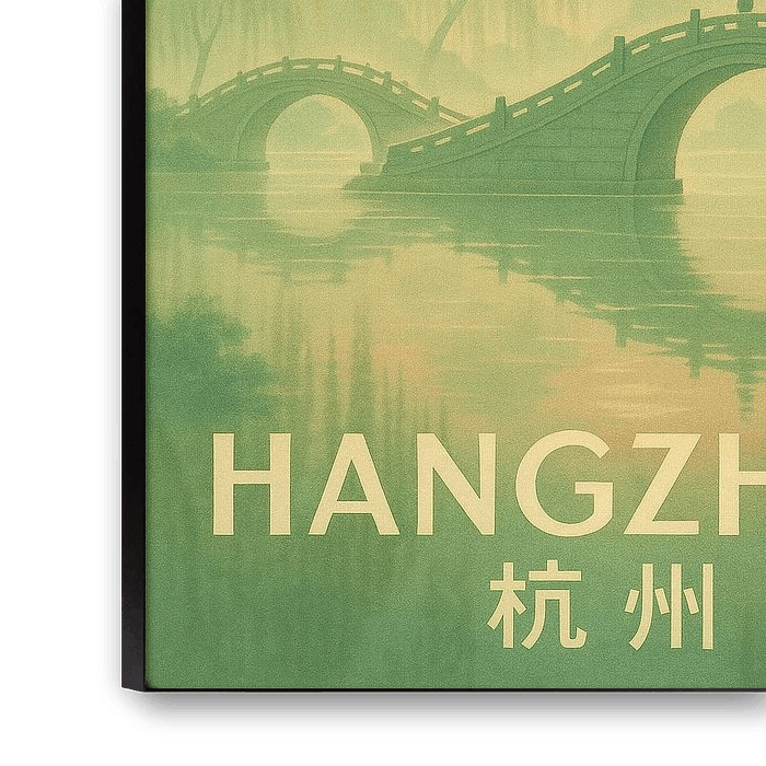 This artwork reflects the feeling of strolling along West Lake’s pathways, listening to the faint rustle of leaves, and watching reflections ripple gently beneath the bridges. It celebrates the city’s refined landscape culture — shaped by centuries of garden design, classical storytelling, and spiritual retreat.