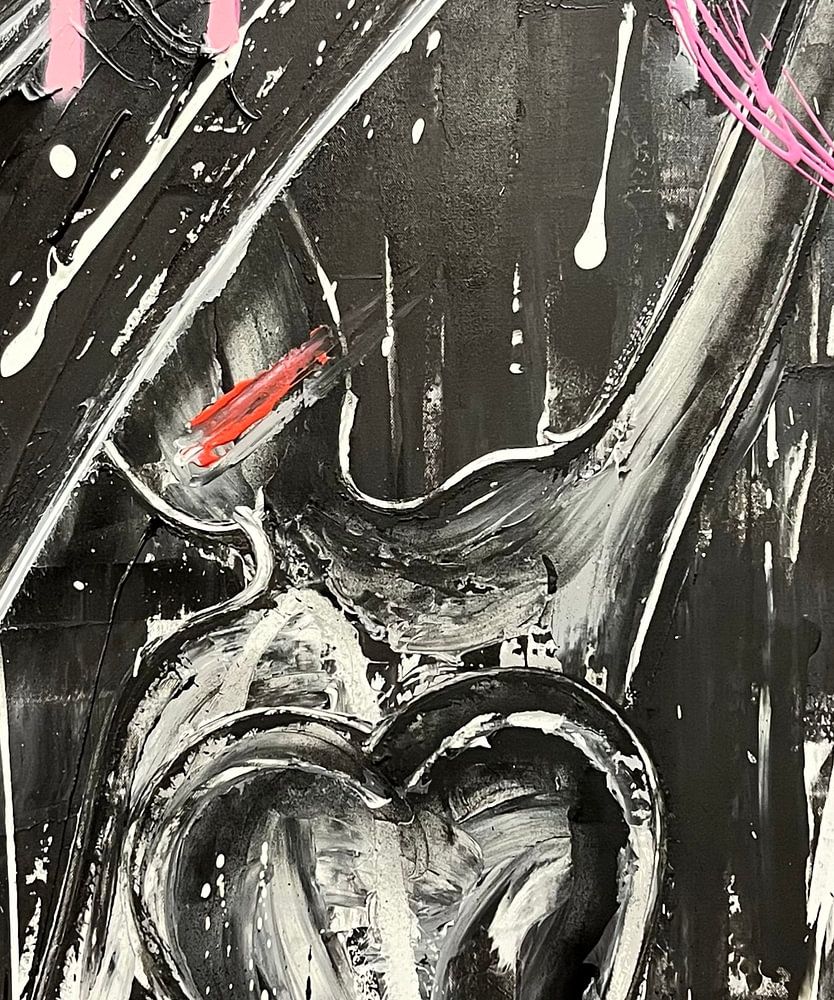 A black-and-white painting titled "Happiness," depicting a large, central heart. Interwoven within the heart are symbols of love, self-love, joy and acceptance. The composition is minimalist, with soft lines and shadows highlighting the contours of the heart and other subtle details. A subtle, striking accent is the red colour of a figure's lips, which adds a sense of warmth and passion. Over the heart runs a pink text, playful and graceful, which conveys the message "Celebrate life!". The whole radiates positivity and joy.