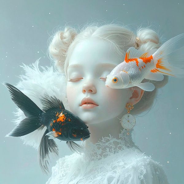 A beautiful girl, with pale, porcelain-like skin and closed eyes, is dreaming her dream. Her earring is a little bell, symbolising the time for dreaming, a magical moment. She has a serene, peaceful expression, innocent and pure. The fish floating around her head symbolise her thoughts, ideas drifting about. The light and white colours…