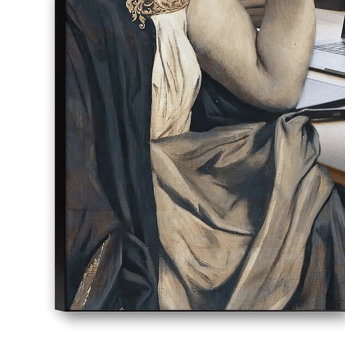 In this collage titled "Happy Mondays," the stress and monotony of work blend into a symphony of humor and creativity. Through an imaginative approach, a typical scene reminiscent of a neoclassical painting transforms into a playful nod to the viewer. The combination of classical and contemporary elements creates a work that invites the viewer to disconnect from routine and enjoy a moment of fun.