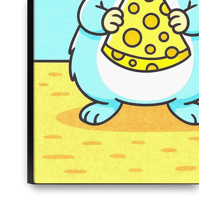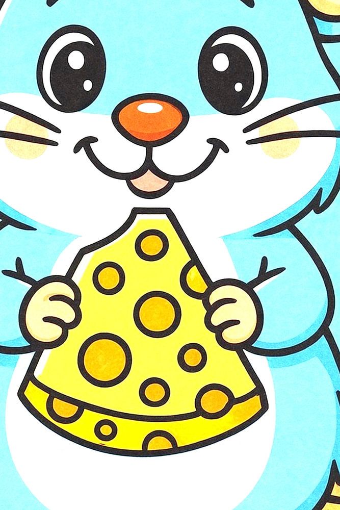 A cheerful blue mouse stands upright with a big, yellow cheese in his paws. His big ears, orange nose and glittering eyes give him a playful and friendly look. The light background and spotty yellow surface enhance the airy, imaginative atmosphere. Perfect for the children's room.