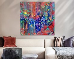 This painting radiates happiness. Who wouldn't be happy with these colours, lovely cells and flowers swirling throughout the work as if everything is in motion.