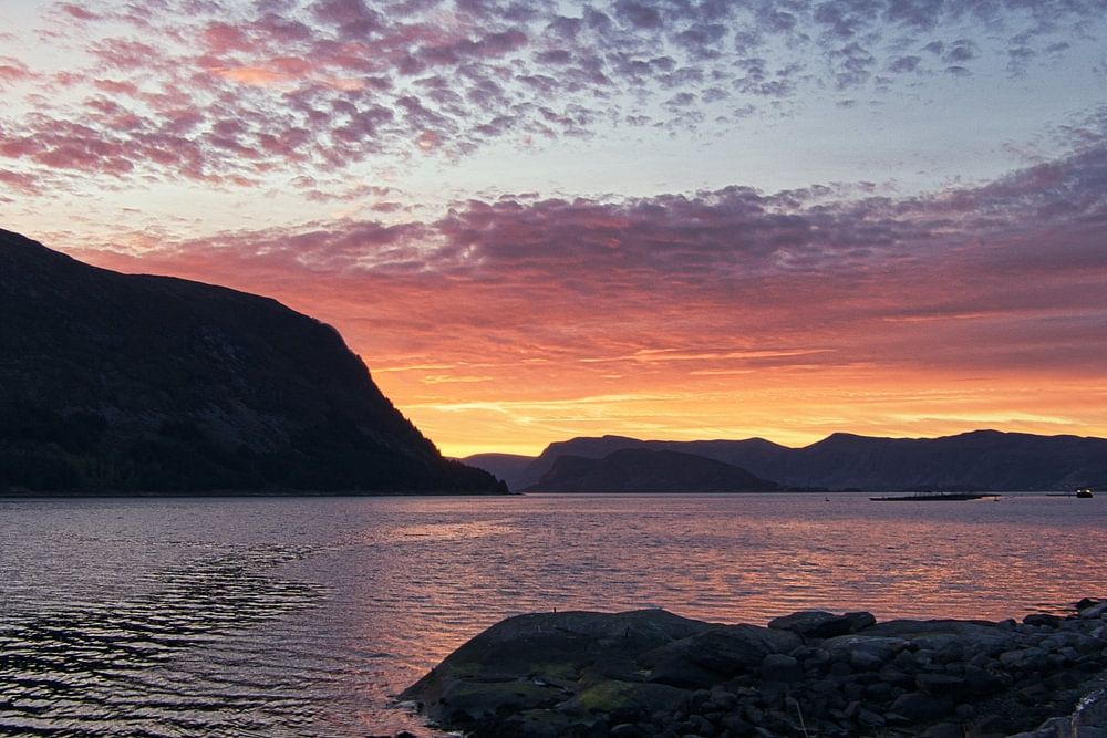 Western Cape in Norway. Harbour on the fjord at blue hour with mountains on the coast. Rough nature in Scandinavia
