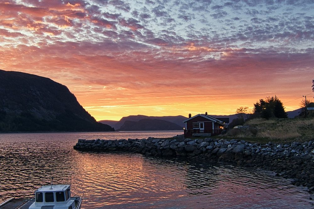 Western Cape in Norway. Harbour on the fjord at blue hour with mountains on the coast. Rough nature in Scandinavia