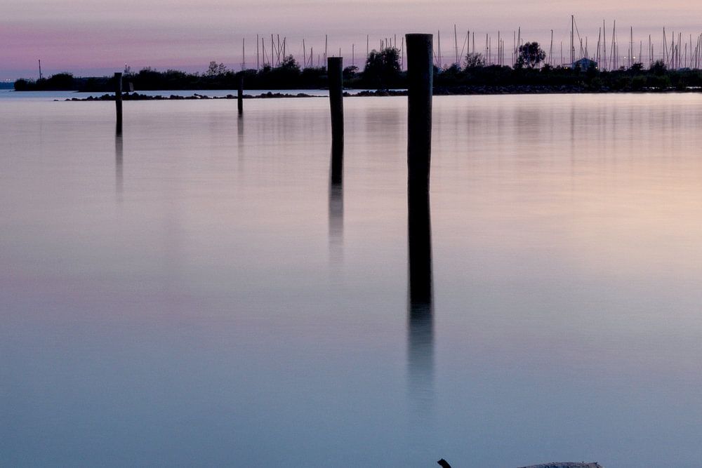 Photo of a beautiful harbor during sunset with a busy marina in the background