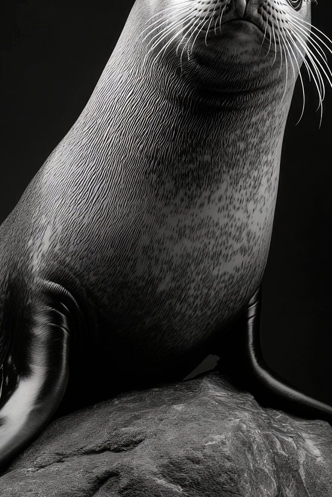 In powerful black and white, the noble seal shines majestically on a smooth rock. Its curious eyes and gentle smile radiate calm and playfulness. This endearing animal motif brings a maritime touch to any living room and promotes a relaxed, harmonious atmosphere. Ideal for nature and animal lovers!