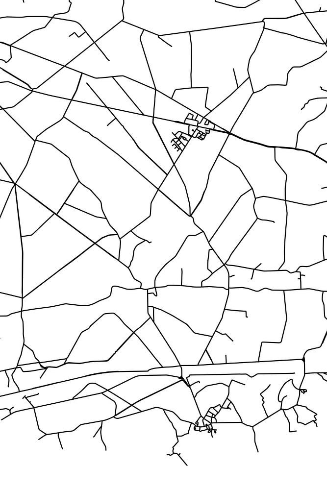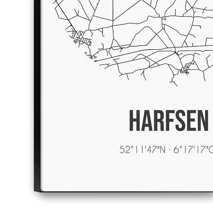 Black and white map, street map or street plan of Harfsen. Harfsen is located in the Achterhoek, in the municipality Lochem, province Gelderland. On the city map all public roads in Harfsen are included. Furthermore, the map is provided with the coordinates of the center of Harfsen.