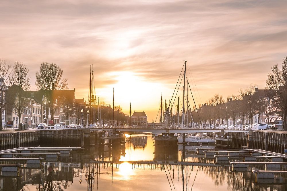 Harlingen's inner harbour on a beautiful spring evening. The sun was setting and gave a beautiful glow to the photo across the water.