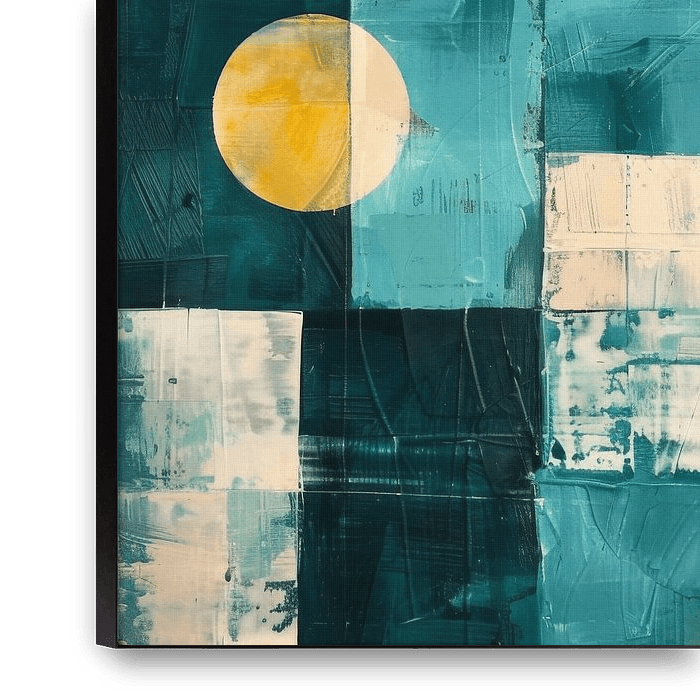 This appealing geometric composition combines soft shades of pink, green and blue with clean lines and shapes. The harmonious colour palette and overlapping elements create a calm yet modern atmosphere that is perfect for stylish living spaces and offices. The soft transitions and balanced arrangement of geometric shapes give the…