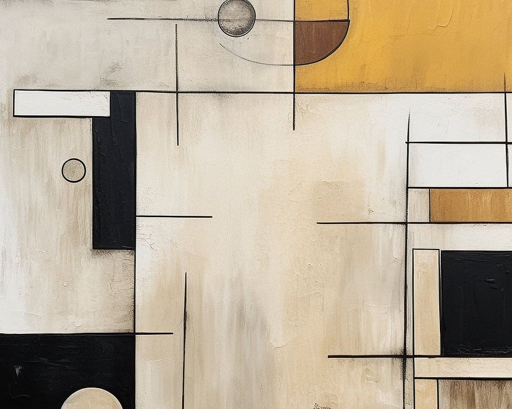 Harmony | Abstract Geometric - The work is an abstract composition with geometric shapes and lines, executed in a subtle colour palette of mainly earth and warm tones, interspersed with black and white. The texture and light distressing give it a lived-in look, making it feel both modern and timeless.