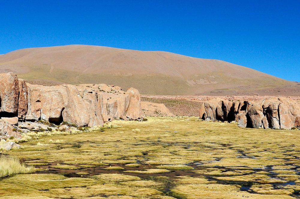 This landscape, captured near the Salar d'Uyuni in Bolivia, is a perfect illustration of the diversity of Andean panoramas. A verdant plain stretches out beneath a brilliant blue sky, while reddish rocks frame the scene. The contrast between the bright colours and the arid texture of the rock creates a unique atmosphere, typical of high desert regions. Small pools of water reflect the sunlight, adding sparkling sparkles that enhance the beauty of this remote location. In this hostile environment, vegetation manages to hang on, offering a glimpse of nature's resilience in the face of extreme conditions. This setting invites travellers to explore the wonders of the Bolivian Altiplano, where solitude and silence reign supreme. The perfect setting for those seeking a change of scenery and serenity.