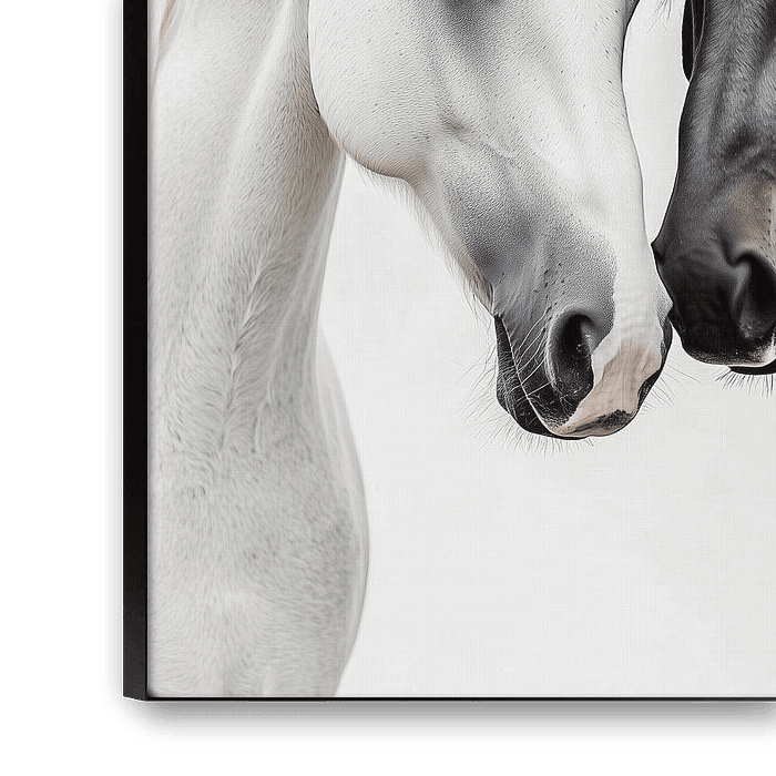 The graceful lines of their heads and manes, combined with the calm and attentive look in their eyes, evoke a sense of mutual respect and calmness. This portrait emphasises the contrasts of light and dark, but also the unity between the two animals, which can be symbolically interpreted as balance between opposites. The simplicity of the background and the lack of other elements in the image reinforce the intensity of their bond, making the work powerful and understated.