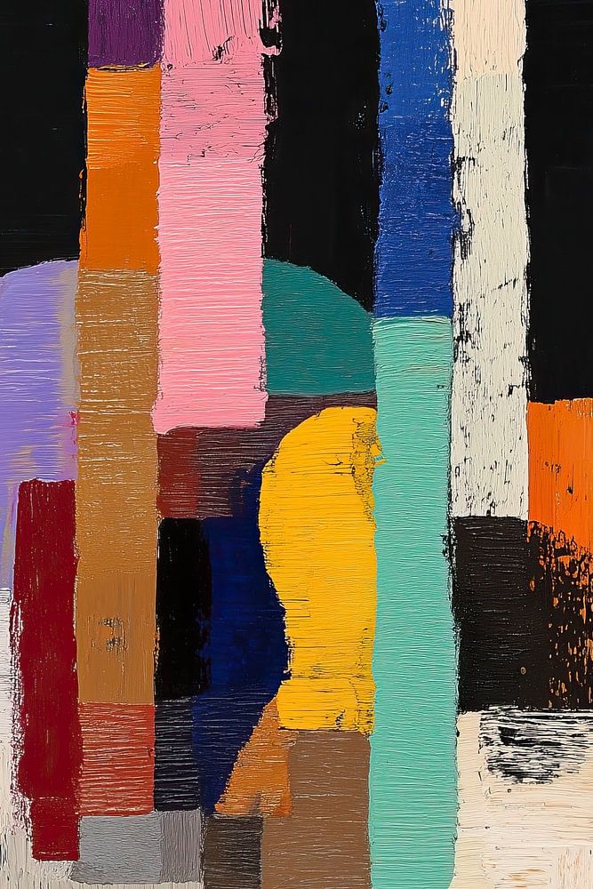 This minimalist abstract painting depicts two guitars in complementary colours, standing out powerfully against a black background. Broad, dynamic brushstrokes in purple, orange, blue, green, brown, beige, red and white give the work energy and rhythm, while the simplicity of the design puts a clear focus on the shapes and interaction…