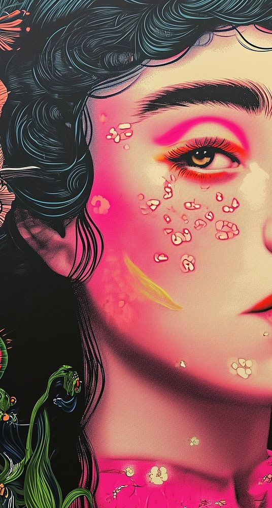 The digital art depicts a woman with long, spiraling black hair standing by the sea. The use of hot aqua, pink, and yellow hues creates a dynamic and energetic vibe, while the inclusion of grotesque caricatures adds an unexpected and slightly unsettling element to the scene.