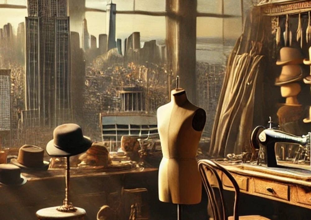 Step into a world of elegance and nostalgia with this beautiful vintage image of a hat studio, set against New York's iconic skyline. A unique representation of craftsmanship and style from days gone by. Perfect for lovers of fashion history, New York and design.