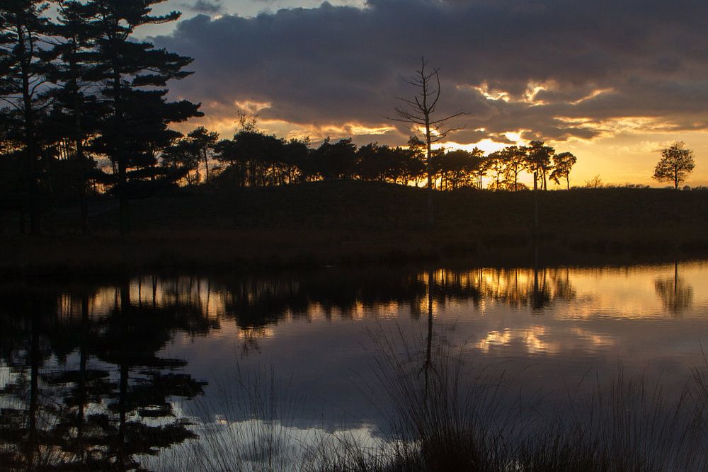 Ik wandel graag in de Hatertse vennen; praktisch mijn achtertuin. Het is een prachtig natuurgebied in alle seizoenen. Een warme zonsondergang over de vennen met een reflectie van de wolken in het water.