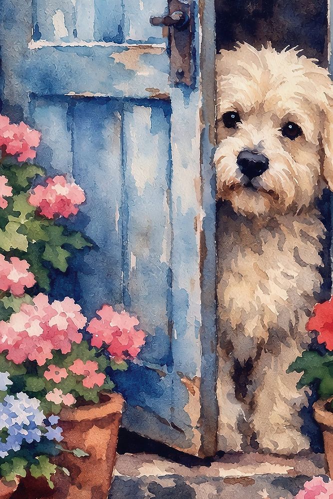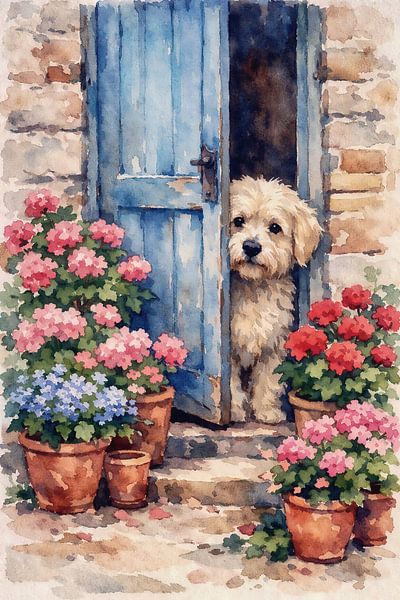 Behind a half-open, weathered blue door, a small dog appears as a silent guardian of domesticity and tranquillity. Surrounded by flowering potted plants and soft stone walls, the work captures a moment of everyday poetry: curiosity, loyalty and a hint of longing for the outdoors. The watercolour-like style and light colour palette give…