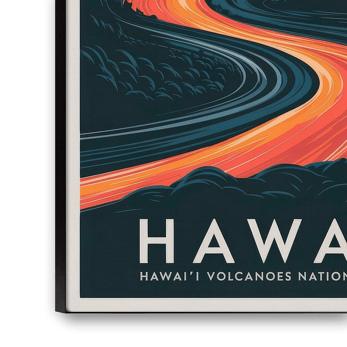 A pulsating interplay of glowing lava and soft clouds under the warm evening sky. The curved line of the river draws the eye into the distant volcanic landscape, while the vibrant colours radiate energy and a sense of adventure. Ideal for the living room, this artwork brings an exotic and inspiring atmosphere to any room.