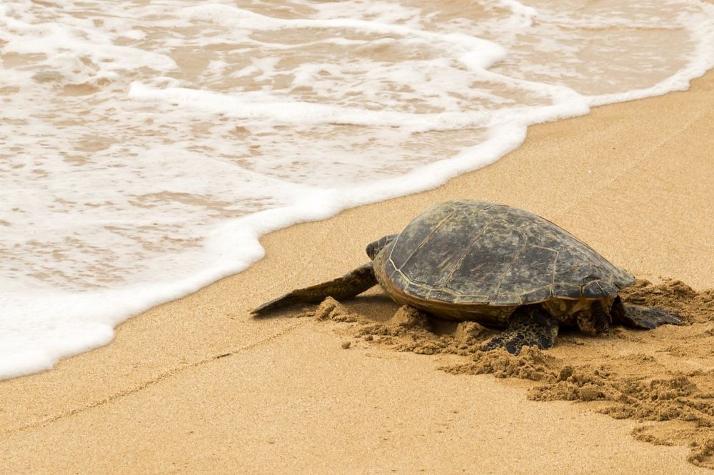 A hawaiian grean sea turtle walking toward the ocean on the north shore of Oahu