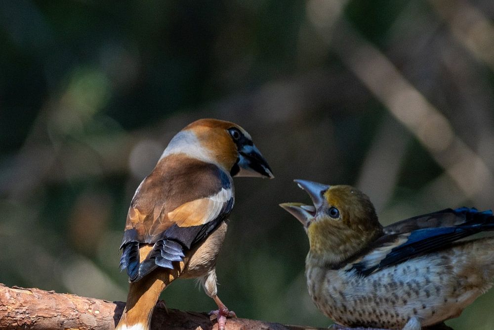 This Apple Finch is feeding the young Apple Finch.