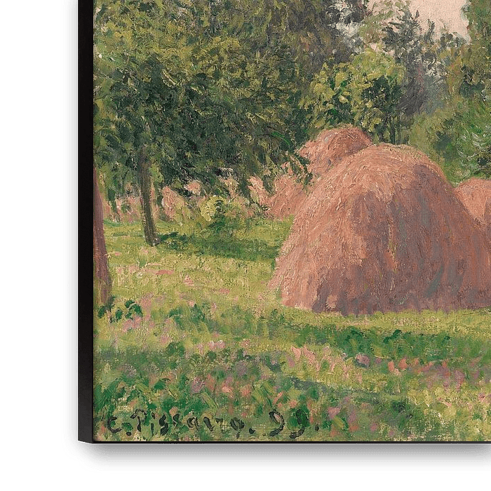 Made the same year as Pissarro’s bird’s-eye views of the Jardin des Tuileries in Paris, this idyllic scene of a meadow near the artist’s home in rural Éragny is a counterpoint to his paintings of modern urban life. Pissarro depicted the same trio of haystacks, seen from a slightly different vantage point, and under afternoon rather than morning light, a practice recalling Monet’s Haystacks series of the early 1890s.