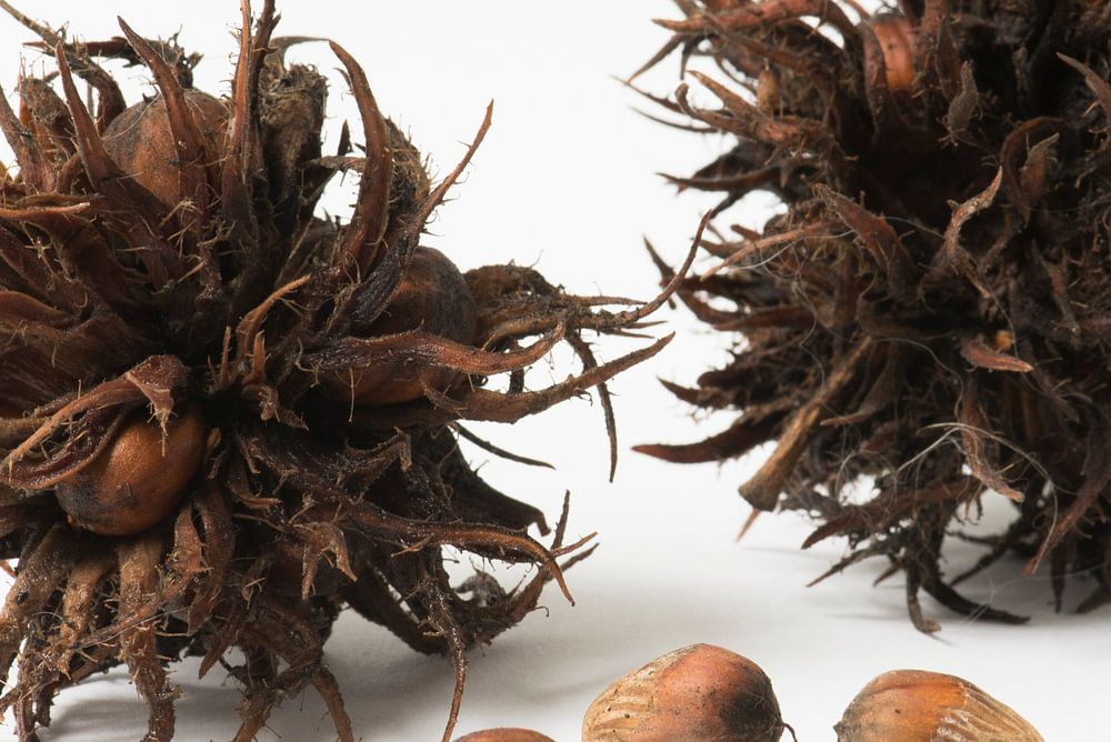 Hazelnoten met bolster in daglichtstudio gefotografeerd.