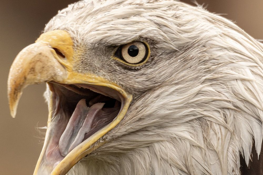 Photo of the head of an American bald eagle in close up. The beak is open. The white head and part of the brown body are visible. A strong portrait for the lover of birds of prey. The American bald eagle or white-headed sea eagle (Haliaeetus leucocephalus) is a bird of prey that breeds in Canada and the United States. At the end of the 20th century, the bird was on the verge of extinction, but today the population has recovered to a stable level. It always reminds me of (cartoon) films.