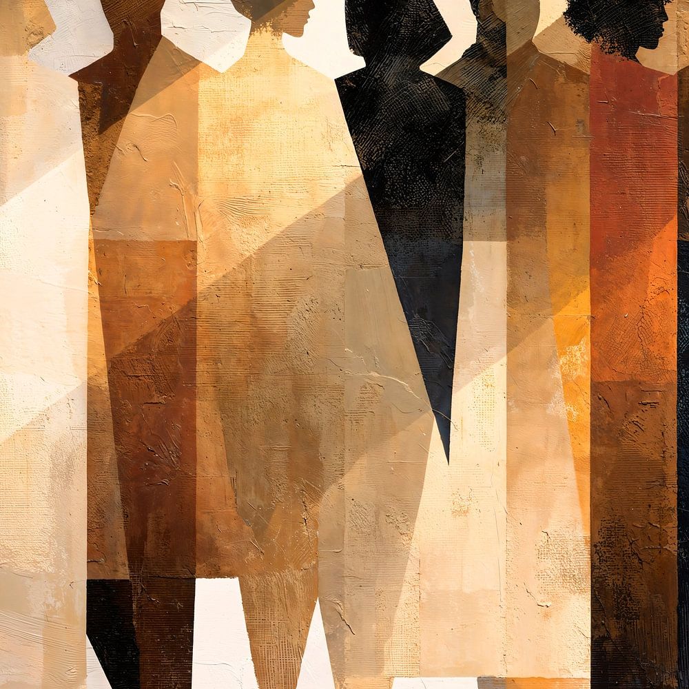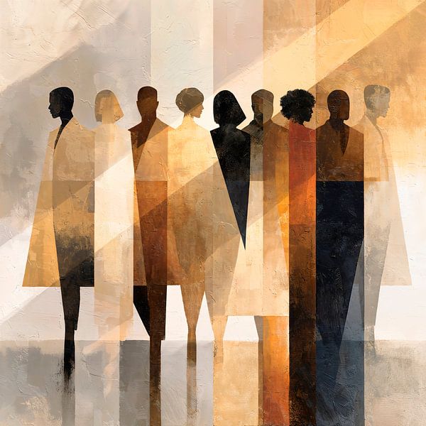 A stylised abstract composition featuring a group of human silhouettes, geometric shapes and sharp lines defines their forms and creates a sense of modern elegance. Sunlight falls from the side, accentuating facets of their bodies and lending them a translucent quality. The artwork evokes a sense of collective identity and individual…