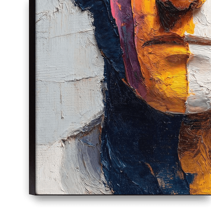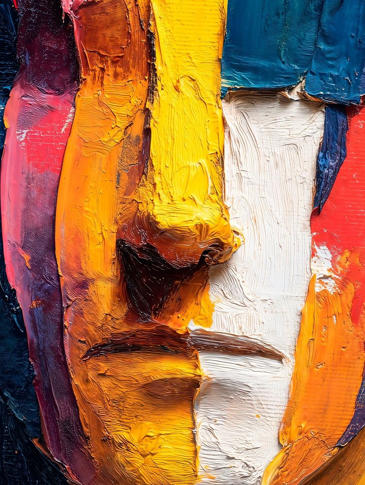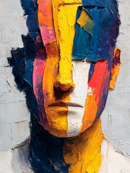 An abstract portrait of a human face, emphasising a structured impasto painting style where the facial features are built up from thick layers of paint, giving a three-dimensional effect. The interplay between colour and texture captures the emotional depth and complexity of the subject.
