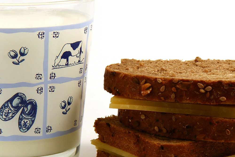 Two wholemeal sandwiches with cheese and a glass of milk with a delft blue motif on a white background.