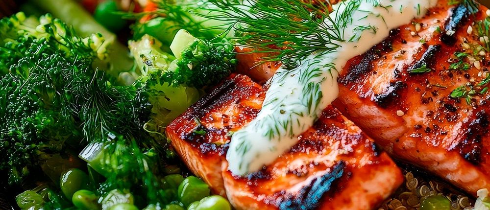 A culinary masterpiece unfolds in a bowl: juicy, grilled salmon is framed by colourful vegetables and quinoa, refined with a creamy dip. The fresh colours and appealing texture invite you to enjoy. This work of art finds its ideal place in a modern kitchen or an inviting dining area.