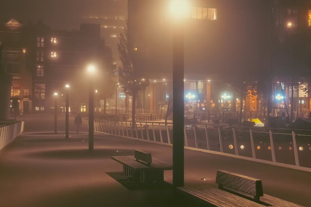 On this day, I walked in the woods with my camera in the morning because of the fog. In the evening, the fog reappeared so I quickly set off again to my favourite spot: the Wilhelminapier or the whorehouse "the whorehouse". This name came about because of its proximity to the area, which was historically known for prostitution.