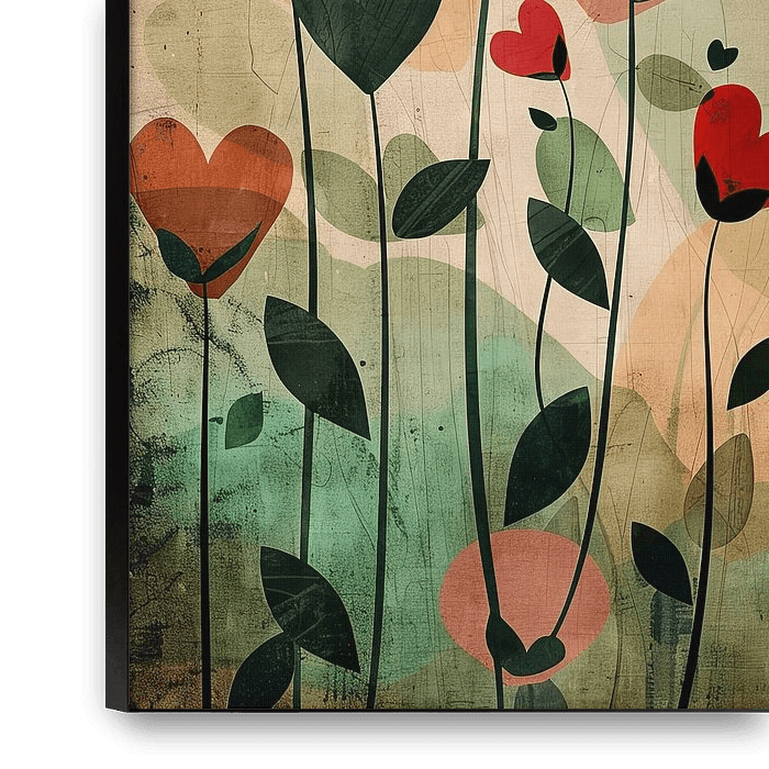 This colourful illustration shows a variety of heart-shaped flowers in warm shades of red and green. The harmonious composition and vibrant colours bring freshness and joy to any room. Ideal for the living room or office, this nature art will give your home a cheerful and inviting atmosphere. The modern and abstract depiction of the…