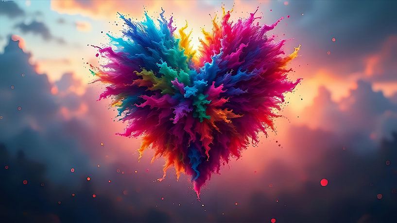 In this vibrant picture, a breathtaking explosion of colour unfolds in the shape of a heart, immediately captivating the eye and appealing to the senses. The vibrant colours - from bright red and warm orange to soothing blue and vivid purple - dance in harmonious waves, blending into a spectacular kaleidoscope. This dynamic composition…