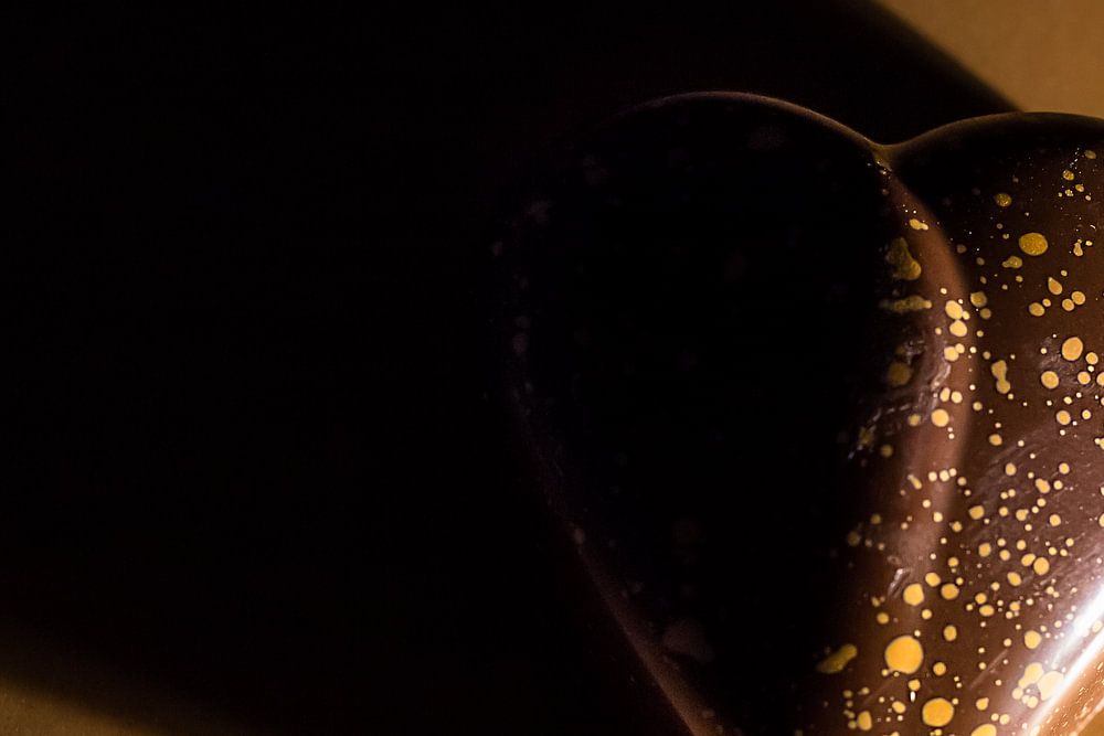 A delicious bonbon, heart shaped, covered in milk chocolate with golden spots.
