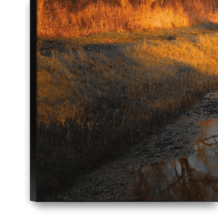 The golden hour transforms Haarsteeg into a picturesque scene. The sun casts its warm glow over the trees along the ditch, illuminating their branches in deep shades of orange and gold. To the right, in the shadows, a thin layer of snow stubbornly remains-a beautiful contrast between autumn and winter. The ditch itself draws your gaze…