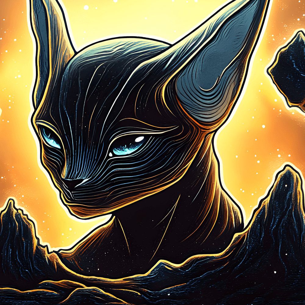 Background & symbolism: Floating fragments of meteorite rock circle around the cat, hinting at its dominion over the vastness of space. Rugged, dark peaks protrude from the base, grounding the figure in the midst of the starry void and symbolising a balance between creation and destruction.