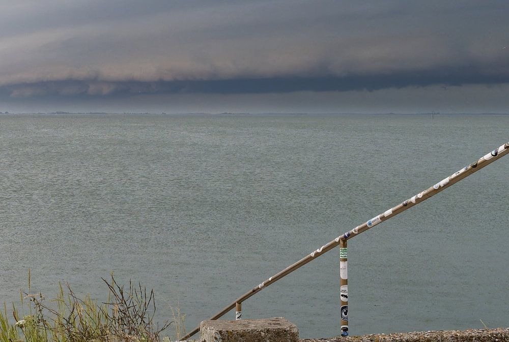 A rolling cloud, also called an arcus cloud (Cumulonimbus arcus) arriving from the sea, over the water barrier over the Oosterschelde.